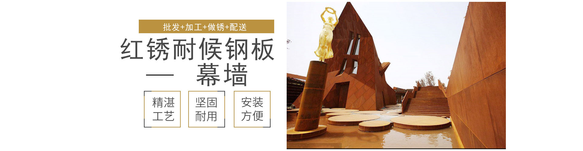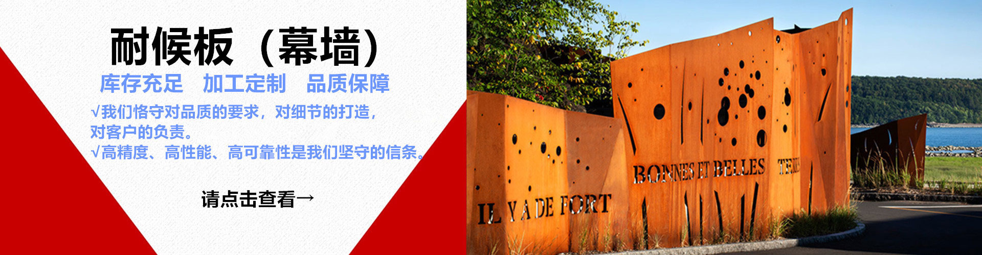 山東沃卡金屬制品有限公司提供耐候板深加工,如雕花、鏤空、刻花、折彎等。還有耐候板的園林景觀裝飾加工,如銹鋼板、紅銹鋼板等。鐵紅色銹蝕鋼板(即紅色幕墻鋼板,景觀鋼板,雕刻鋼板)是介于普通鋼和不銹鋼之間的價(jià)廉物美的合金鋼系列,在融入現(xiàn)代冶金新機(jī)制、新技術(shù)和新工藝后得以可持續(xù)發(fā)展和創(chuàng)新,屬世界超級(jí)鋼技術(shù)前沿水平的系列鋼種之一。鐵藝紅幕墻鋼板由普碳鋼添加少量銅、鎳等耐腐蝕元素而成,具有優(yōu)質(zhì)鋼的強(qiáng)韌、塑延、成型、焊割、磨蝕、高溫、疲勞等特性;耐候性為普碳鋼的2~8倍,涂裝性為普碳鋼的1.5~10倍,能減 薄使用、裸露使用或簡(jiǎn)化涂裝使用。該鋼種具有耐銹,使構(gòu)件抗腐蝕延壽、減薄降耗,省工節(jié)能的特性,使構(gòu)件制造者、使用者…